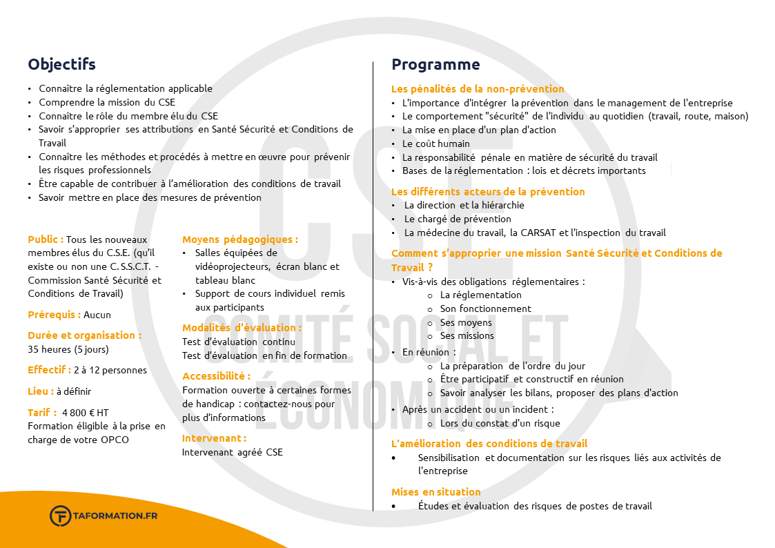 Dans un contexte où la santé et la sécurité au travail sont des enjeux majeurs, nous proposons des formations conçues pour vous aider à protéger vos collaborateurs. Certaines, comme la formation CSE (obligatoire dès 11 salariés) et la formation SST (imposée dans les secteurs à risque), répondent à des obligations légales. D’autres, telles que nos modules sur la prévention du burn-out, abordent des problématiques cruciales qui impactent de nombreuses entreprises et leurs équipes. Adaptés aux besoins spécifiques de votre organisation, nos programmes visent à instaurer un environnement de travail sûr et serein.