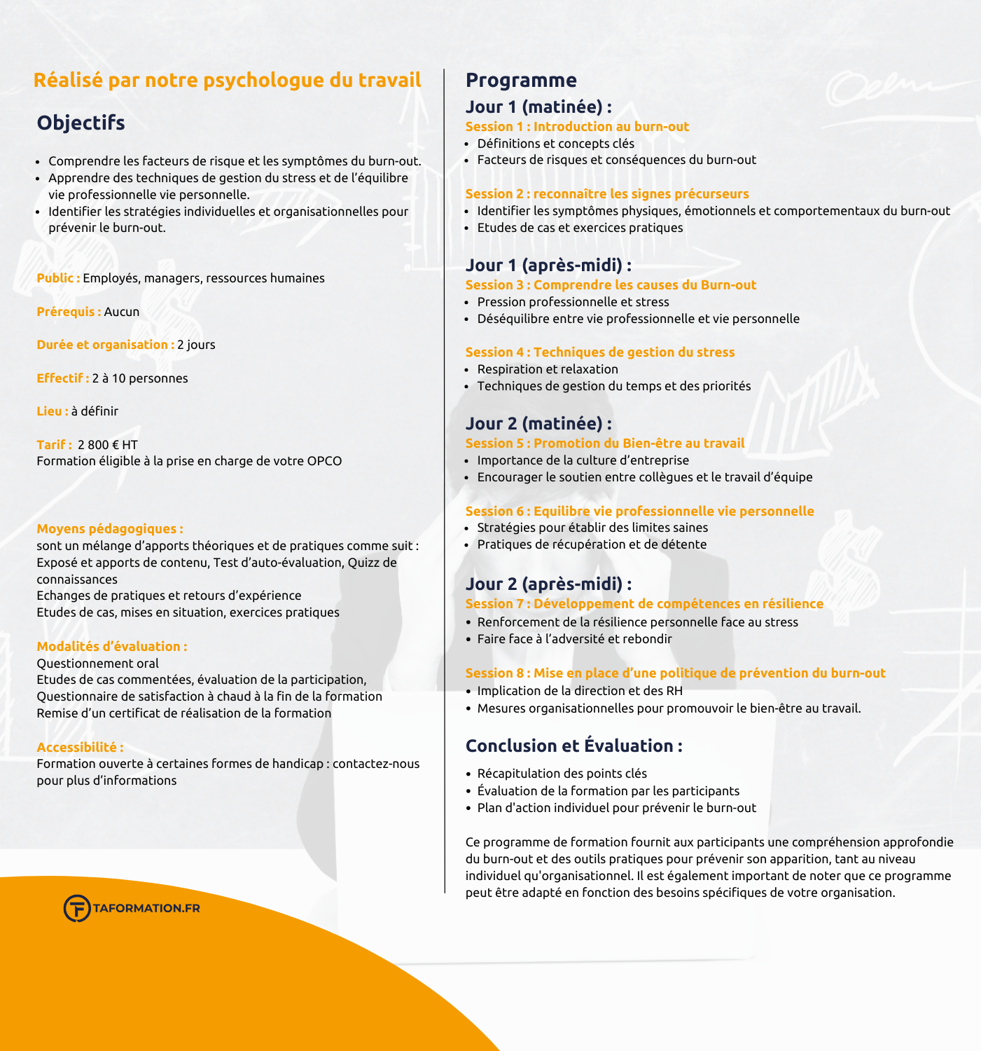 Investir dans nos formations, c’est garantir la sécurité de vos collaborateurs tout en favorisant leur bien-être. Protéger vos équipes ne se limite pas à respecter des obligations légales, mais consiste aussi à prévenir les situations à risque, identifier les signaux de détresse et agir efficacement pour éviter les accidents ou les situations de burn-out.